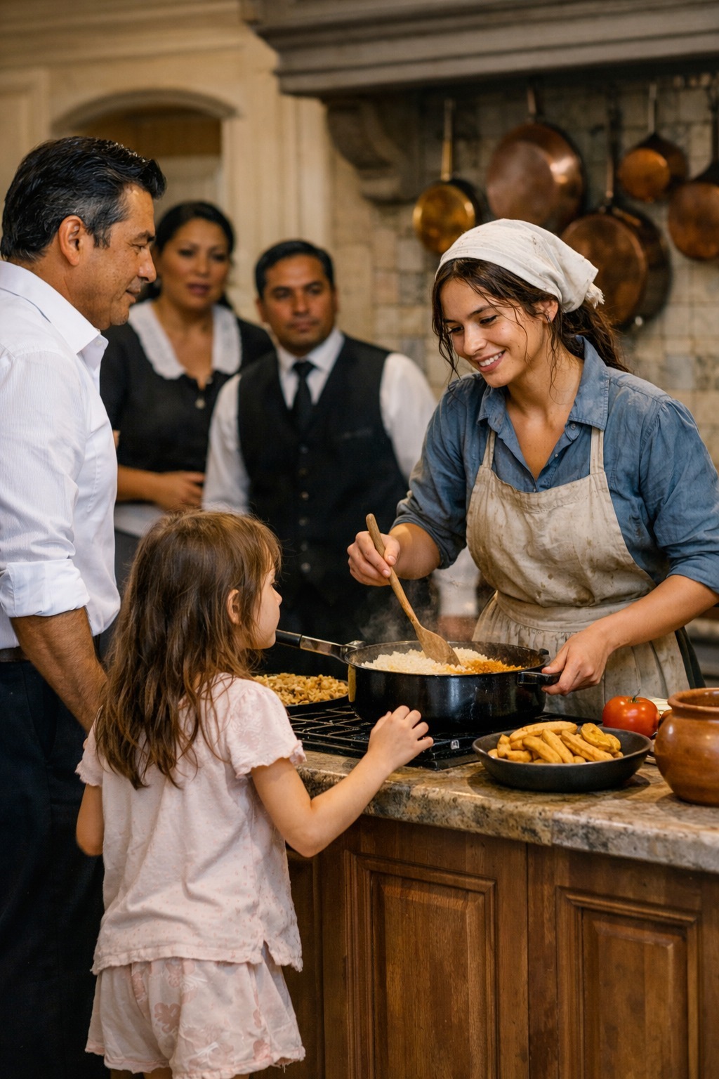 Isabella se detuvo en la entrada de la cocina con una expresión que nadie había visto en meses, una mezcla de curiosidad y una calma inesperada que hizo que todos los presentes contuvieran la respiración. Sus ojos, que antes estaban apagados y cansados, ahora seguían cada movimiento de Elena mientras ella removía el arroz rojo con una cuchara de madera. El aroma llenaba cada rincón de la mansión, envolviendo el ambiente con una sensación de hogar que parecía ajena a aquel lugar lleno de lujo frío.