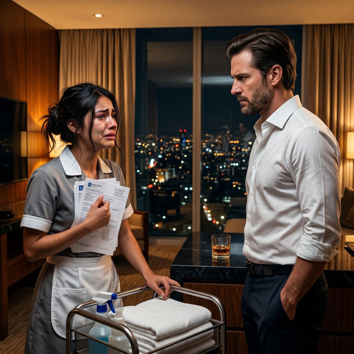 Cuando entré, él estaba frente al ventanal, con la ciudad brillando abajo. Yo intenté hacer mi trabajo rápido, pero al agacharme por una cucharita de plata, el aviso del hospital cayó de mi mandil.