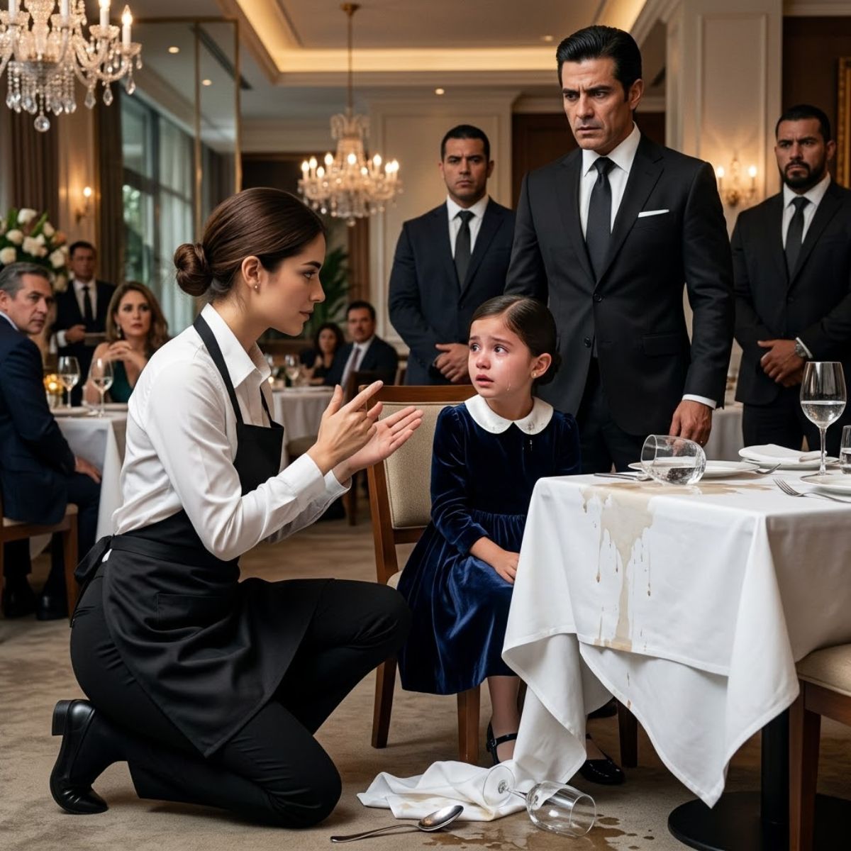 La niña intentó alcanzar su vaso de agua. Sus dedos resbalaron. El cristal se volcó sobre el mantel blanco y mojó la manga de uno de los escoltas.