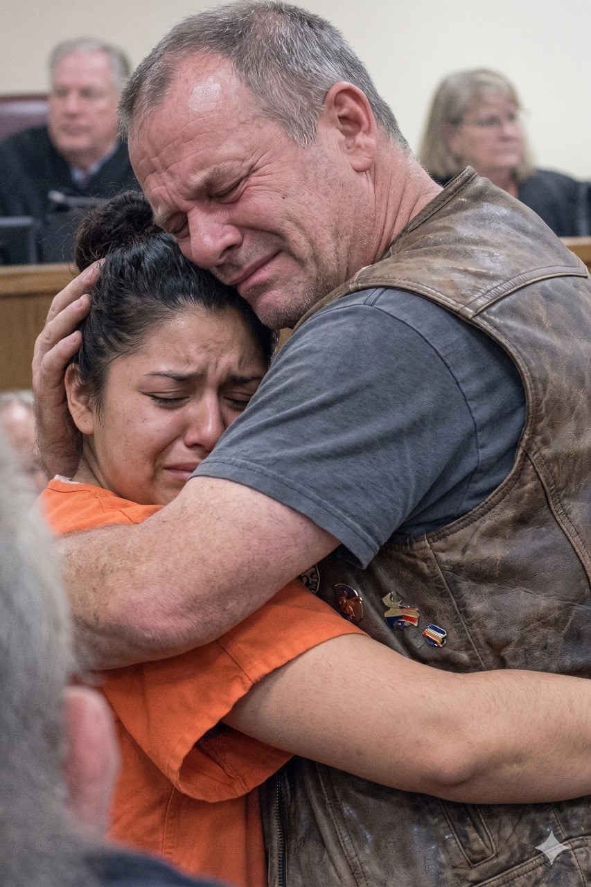 Estaba de pie en esa sala del tribunal con mi chaleco de cuero, sosteniendo a un niño de dieciséis años con un mono naranja mientras una habitación entera miraba con incredulidad. Marcus se aferró a mí, temblando, con la cara enterrada en mi pecho. El juez parecía desconcertado, el fiscal parecía indignado, y mi esposa lloraba en silencio en la fila de atrás.