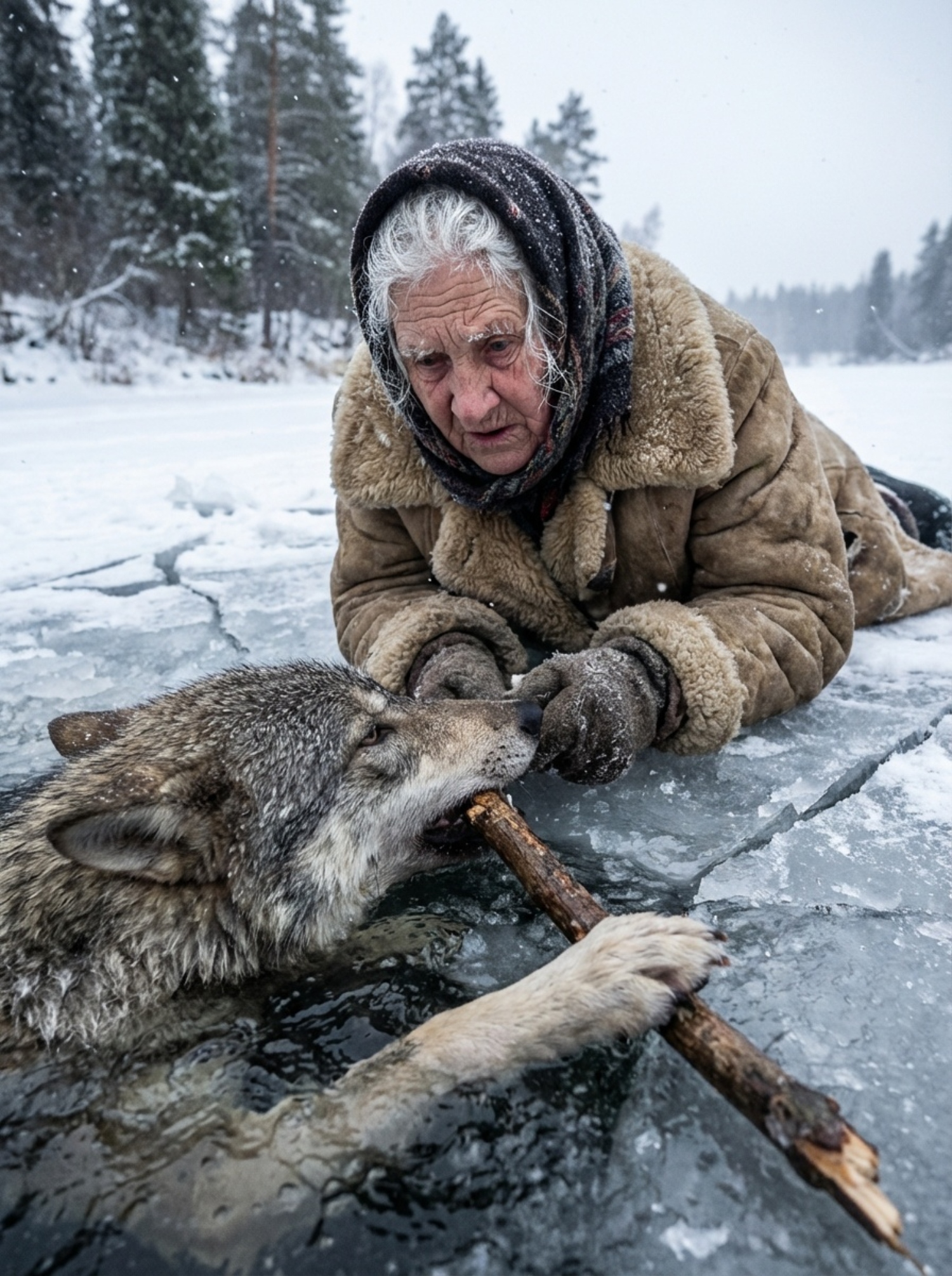 Era un gélido día de invierno y la superficie del lago en las montañas estaba cubierta por una delgada capa de hielo. Mientras una mujer mayor recogía leña, vio un enorme lobo luchando desesperadamente donde el hielo se había quebrado. Sus patas resbalaban, y con cada movimiento se hundía un poco más en las frías aguas. Sin importarle que se tratara de un animal salvaje, la mujer se tendió sobre la nieve y extendió hacia él una larga rama. A pesar del crujido del hielo, no se rindió y, colgándose con toda su fuerza, logró sacar al agotado lobo del agua.